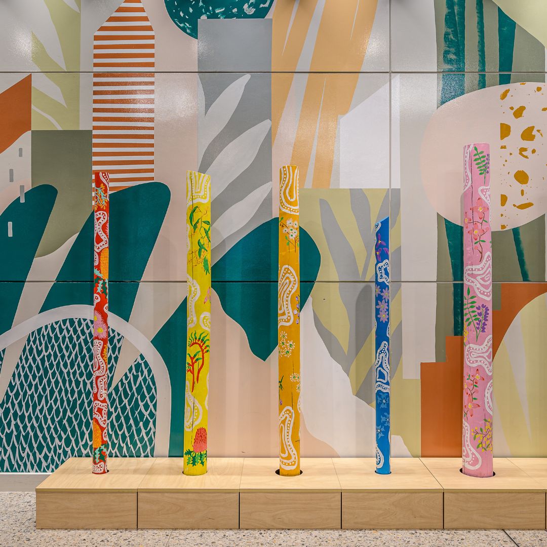 📍 Raine Square, Lower Ground In 2021 we collaborated with local artist, Rosie Paine, to hand paint six totem poles symbolising the six different seasons. The totems formed an art trail displaying through the precinct. In 2022 we learned how the six Noongar seasons | guided food gathering, distributing recipe cards inspired by native ingredients that aligned with each season.We were proud to collaborate with local Whadjuk Ballardong Noongar and Badimaya Yamatji man, Jayden Boundry, for cultural guidance and Whadjuk, Ballardong and Yuat artist Jarni McGuire. |